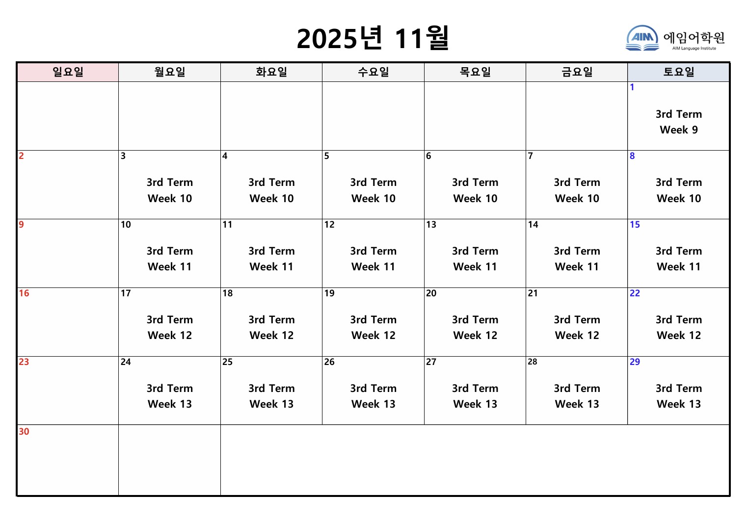 2025년 11월 수업 주차 안내입니다.